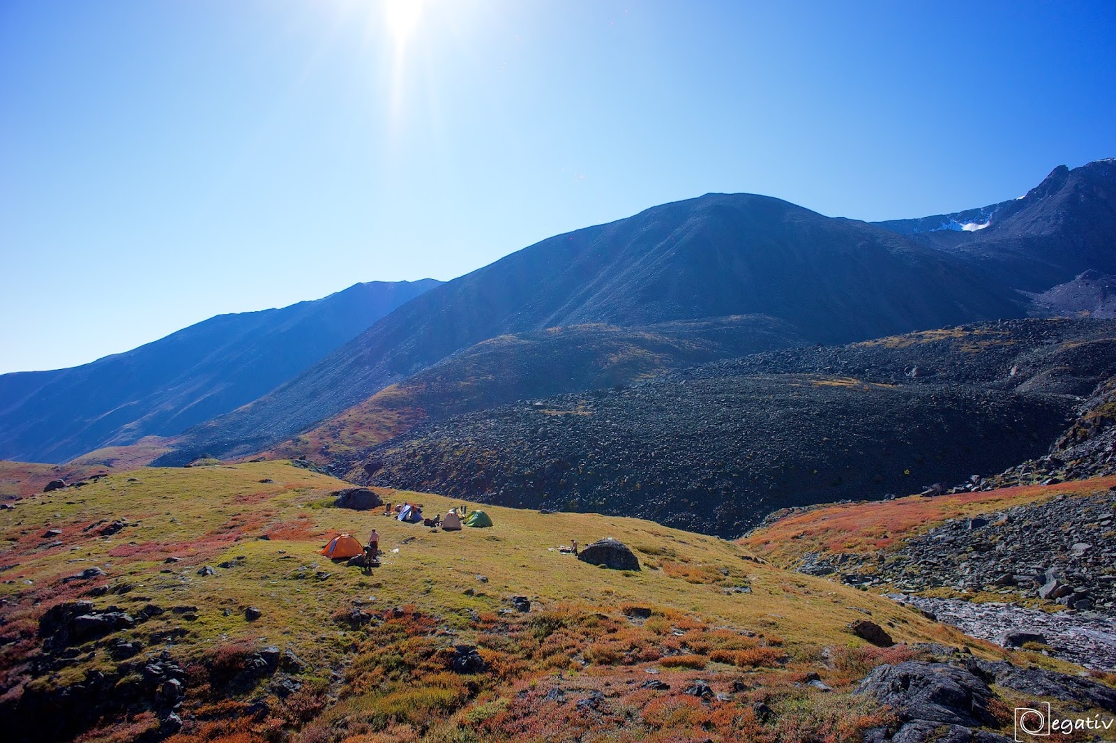 После завтрака и не продолжительных сборов мы двинулись дальше. Шли так е по руслу реки, в основном по курумнику. Несколько раз бродили реку, затем поднялись на небольшое плато где устроили обед. Рассказывать особенно нечего, все время вверх, все время тяжело, но как красиво чет возьми!